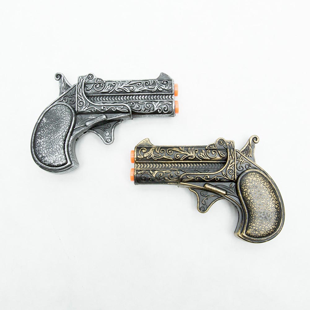 Pirate Must Haves. Pirate Derringers will complete your pirate, swashbuckler, or buccaneer costume! These pirate play guns are perfect for adding instant fun during your buccaneer gathering! 2 faux pirate pistols per package. Pirate toys are approximately 5. Antique finish gold and silver play guns. Orange tips on each toy. Made of plastic. Stock up on pirate costumes, accessories, and pirate supplies to make your Halloween or pirate party one to remember. Keep pirate costume accessories on hand for children of all ages to join in on the pirate party adventure!