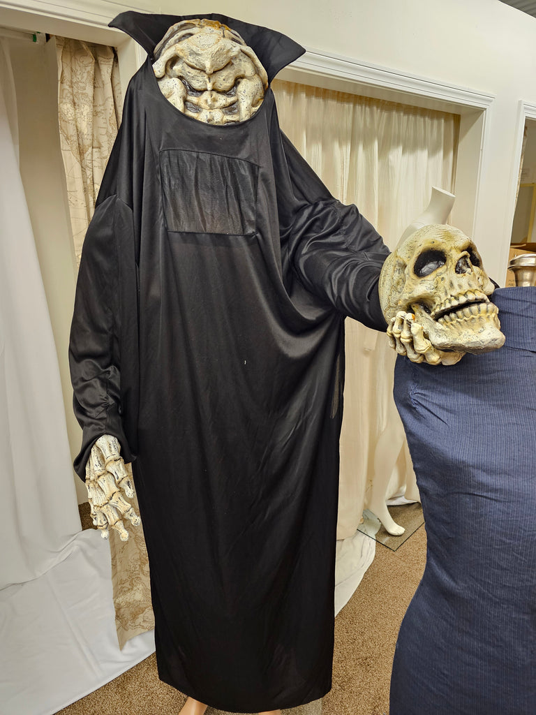 Includes: Robe with attached screaming skull, Skeleton Hand Glove, Spine/collarbone headpiece with elastic band