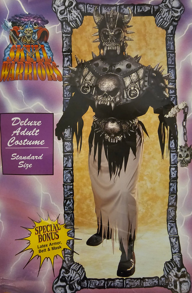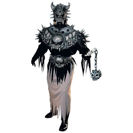 This scary medieval demon warrior costume for adults includes a robe, latex belt, latex armor and latex mask. The Medieval warrior armor skull punisher costume comes in adult size Standard. The skull-shaped mace weapon is not included with the adult skull punisher costume.