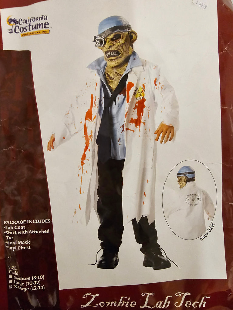 Includes: Lab Coat, Shirt with attached Tie, Vinyl Mask, Vinyl Chest