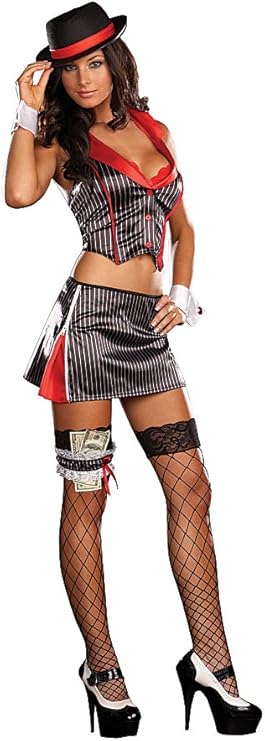 Includes: Vest with removable underwire lace bra, Skirt with adjustable side slits, Hat, Leg garter, Wrist cuffs (6 piece set)