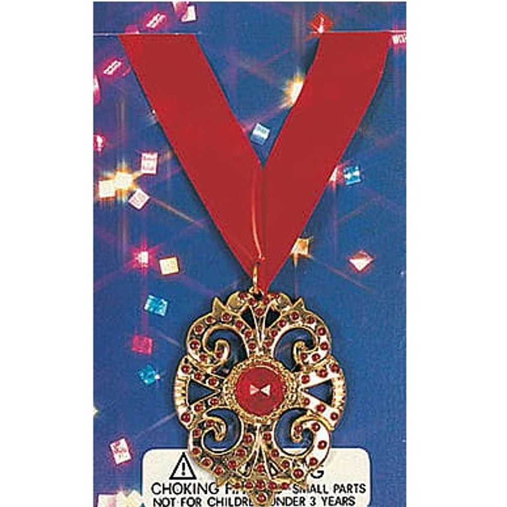Create a chilling look for your costume with this Vampire Necklace! This necklace features a metallic gold plastic medallion with faux red jewel accents attached to a red plastic neck ribbon. One size fits most.
