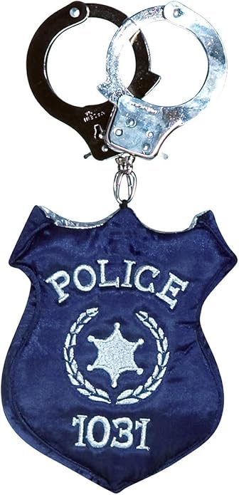 Blue badge shaped bag with silver police lettering and badge number. The handle is a pair of "real" handcuffs (made of metal and includes 2 keys though the keys are not required to open the handcuffs). Bag is about 5 inches across 6 inches tall and about 1 inch in depth.
